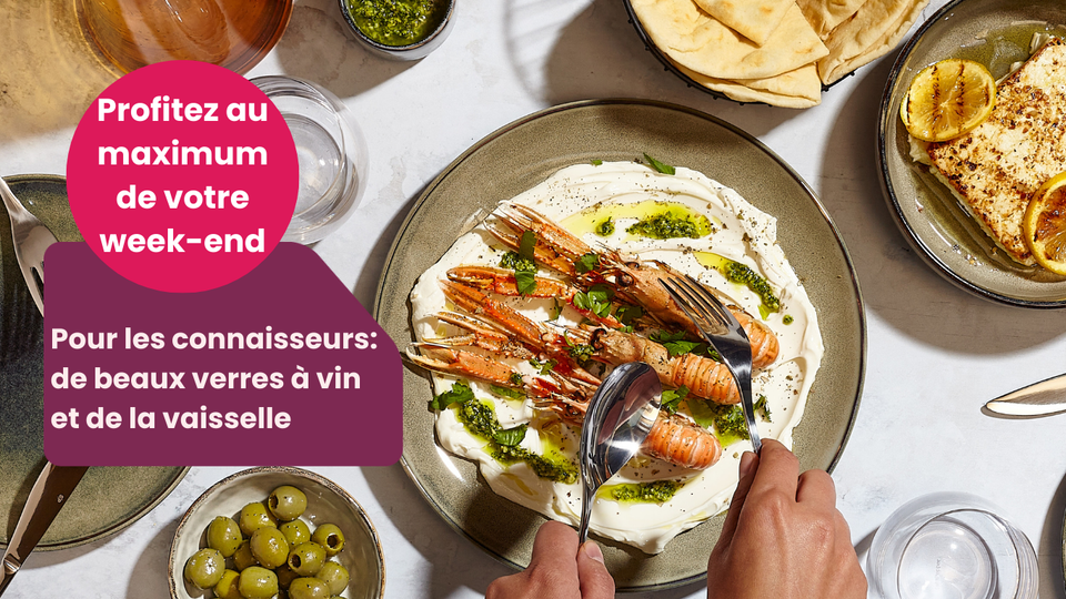 Verrerie, pensez verres à vin : Un bon repas mérite un bon vin, servi dans d'élégants verres à vin. Ces verres sont conçus pour rehausser l'arôme et la saveur de votre vin, faisant ainsi passer votre expérience culinaire au niveau supérieur. Choisissez parmi les plus grandes marques telles que Riedel et Schott Zwiesel.