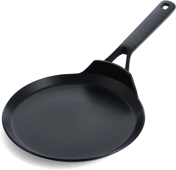 "Une poêle à frire a généralement des côtés inclinés et un fond large et plat. En revanche, une poêle à crêpes a un fond plat et des bords bas. Les poêles à crêpes sont généralement plus petites que les poêles à frire, et certaines possèdent plusieurs cavités pour faire frire plusieurs petites crêpes simultanément, comme la poêle à crêpes Westinghouse, par exemple. Les poêles à frire sont plus polyvalentes et conviennent pour frire, rôtir et mijoter divers plats. Les poêles à crêpes, quant à elles, sont généralement utilisées pour faire frire des crêpes".