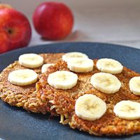 Havermoutpannenkoeken met appel en banaan zijn een voedzaam en snel ontbijt, klaar in slechts 10 minuten. Het beslag van havermout, geraspte appel, ei, plantaardige melk en speculaaskruiden wordt gebakken tot goudbruin. De pannenkoeken worden afgemaakt met plakjes banaan, maar je kunt ook variëren met ander fruit zoals kiwi, aardbeien of bosbessen. Dankzij de vezels in havermout blijf je lang verzadigd.