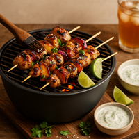 Snelle, zomerse spiesen die perfect zijn voor een tafelbarbecue: malse kip met een lichte sojahoninglek, gegrilde perzik en frisse limoen-yoghurtsaus. Ideaal als hoofdgerecht of om te delen bij borrelhapjes aan tafel.