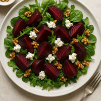 Een frisse salade met geroosterde bieten en romige geitenkaas.