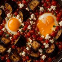La shashuka aux aubergines et à la feta est un savoureux plat dans une poêle dans lequel des œufs pochés mijotent dans une sauce tomate épicée avec des poivrons, des aubergines et des herbes. La sauce est parfumée au ras el hanout, tandis que la feta émiettée et la coriandre fraîche complètent le plat. Ce classique marocain est facile à préparer et parfait à servir dans un tajine pour une touche authentique.