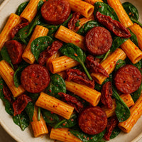 Snelle, pittige pasta met chorizo, spinazie en zongedroogde tomaten voor een doordeweekse maaltijd met een Mediterraans tintje.