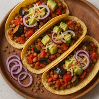 Les tacos végétariens à l'avocat sont un plat mexicain rapide et sain, plein de légumes et de saveurs. Un mélange d'aubergines, de poivrons, de lentilles et de tomates en dés est assaisonné de cumin et de poudre de paprika et servi dans des tacos chauds. Les tacos sont garnis de cubes d'avocat et de fromage râpé pour un délicieux repas sans viande.