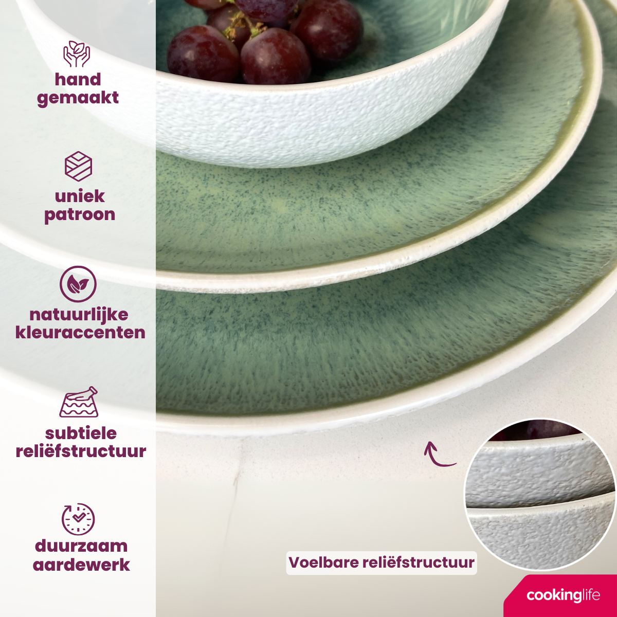 La couche d'émail réactive peut entraîner des différences de couleur : chaque pièce de vaisselle est donc unique. Le fond des assiettes de la collection Cookinglife Belize est blanc et présente un subtil relief.