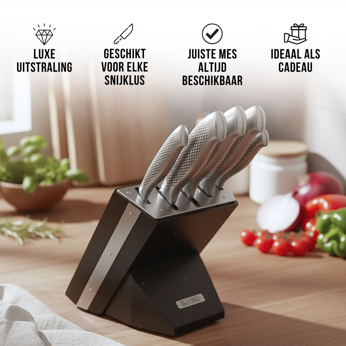 Description Bloc de couteaux Blackwell - Noire - Couteau de chef, Couteau Santoku, Couteau à pain, Couteau d'office & Couteau éplucheur 6 pièces
