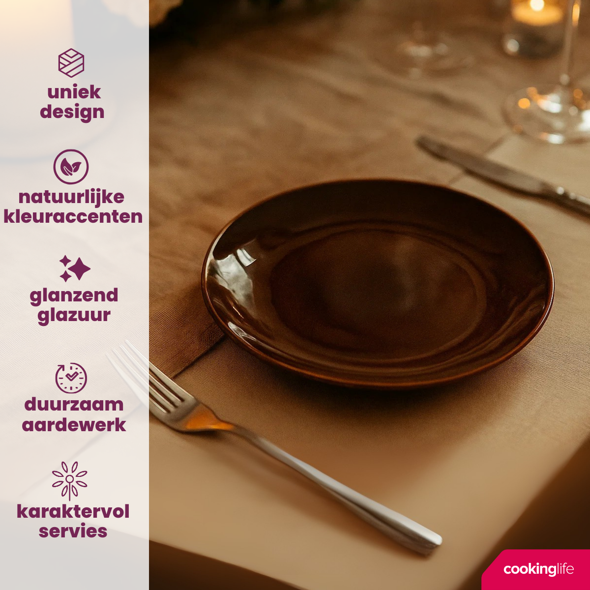 Ajoutez du charme à votre table avec cet ensemble de 6 bols Sabi de couleur brune chaude de Cookinglife. Ces bols sont fabriqués en céramique robuste avec un aspect rustique, parfaits pour la soupe, les accompagnements ou d'autres délicieuses portions. Grâce à leur design naturel et intemporel, ils s'intègrent aussi bien dans des décorations de table modernes que campagnardes. De plus, vous pourrez en profiter pour un usage quotidien pratique grâce à leur entretien simple.