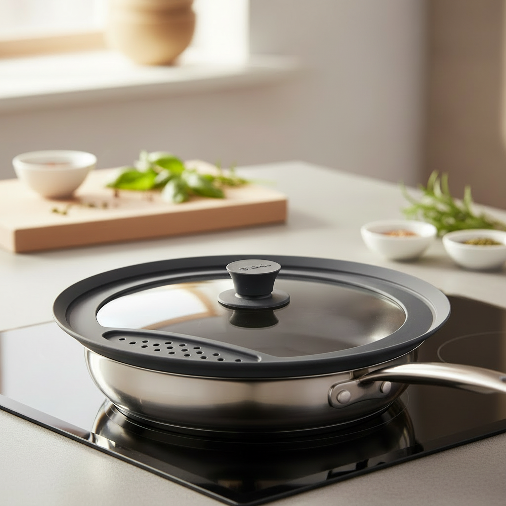 • Transparant glazen deksel — je ziet wat er in de pan gebeurt zonder warmte te verliezen.