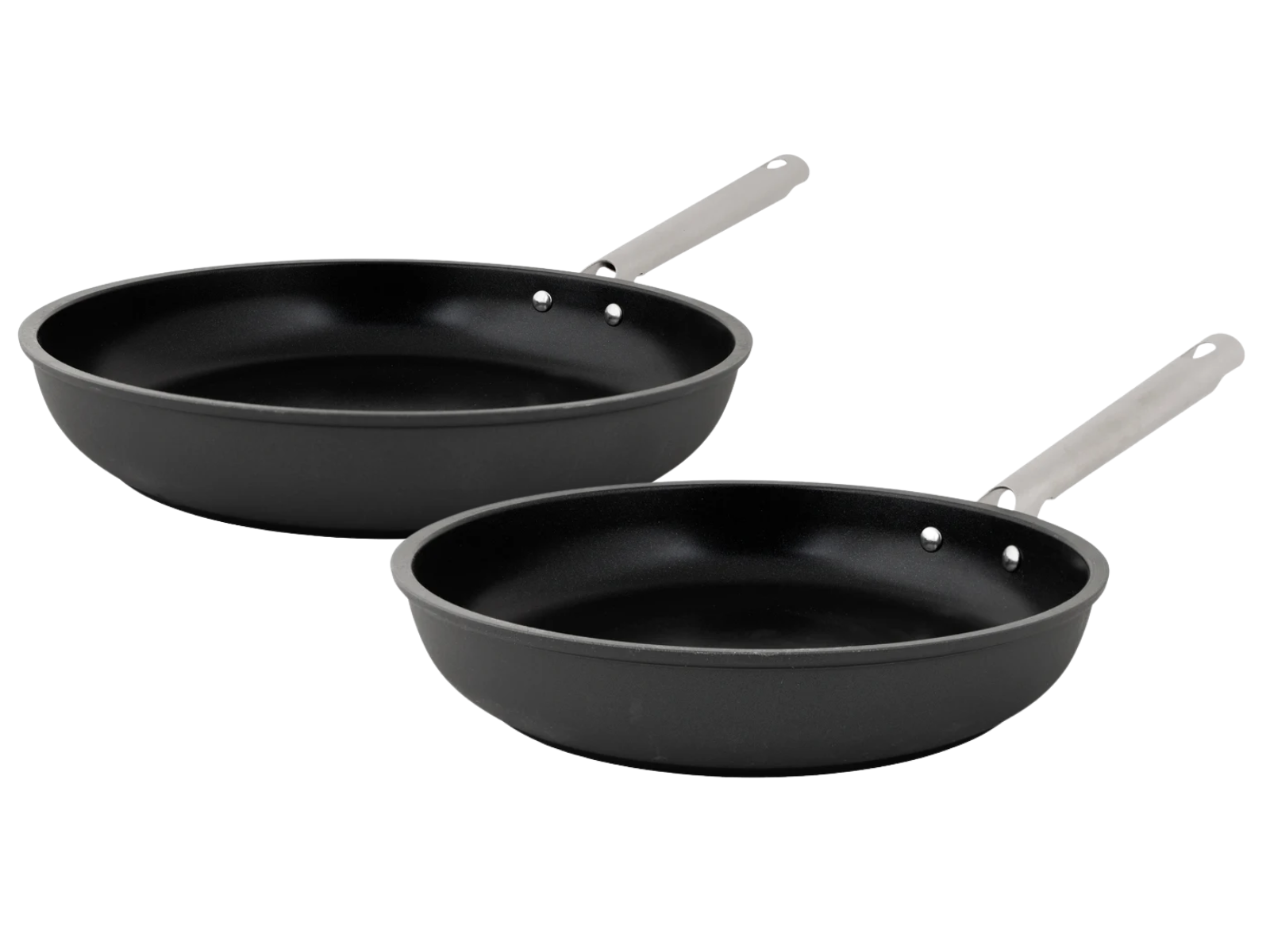 Deze koekenpannenset uit de ProForge-lijn van Cookinglife bevat twee maten (24 en 28 cm) met een keramische anti-aanbaklaag. De pannen zijn PFAS-vrij, gemaakt van aluminium, en geschikt voor alle warmtebronnen, inclusief inductie. Ideaal voor wie verschillende gerechten wil klaarmaken zonder steeds van pan te wisselen.