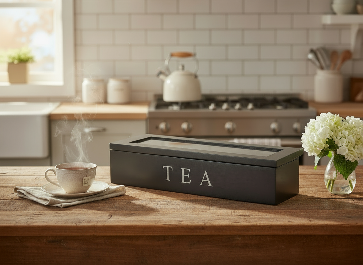 Met deze zwarte theedoos van Cookinglife organiseer je je theezakjes netjes en overzichtelijk. Dankzij de zes vakken scheid je eenvoudig verschillende smaken, zodat je altijd snel vindt wat je zoekt. Het tijdloze, donkere design staat mooi in elke keuken of op een gezellig gedekte tafel. Zo maak je van elk theemoment iets extra’s.
