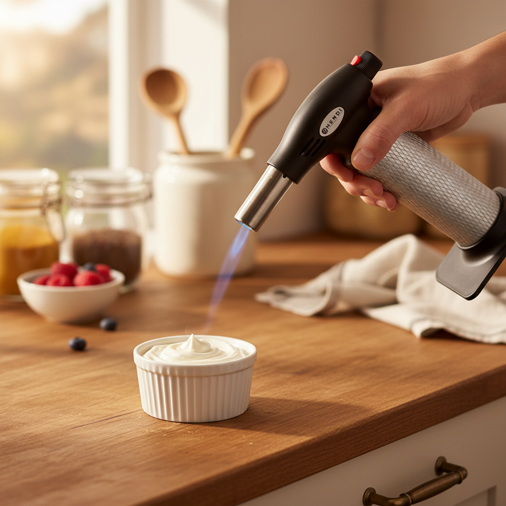 Aimez-vous la crème brûlée ? Alors un chalumeau à crème brûlée est indispensable. Ce brûleur de la marque Hendi tient idéalement dans votre main et la flamme atteint 15 cm. Vous pouvez déterminer le réglage du gaz grâce au bouton rouge. Le réglage du gaz dispose également d'un allumeur intégré. De plus, il est également réglable avec précision et une sécurité rotative est présente. Lors de l'achat de ce chalumeau à crème brûlée, le brûleur est livré non rempli. Vous pouvez commander cette recharge séparément chez nous.