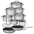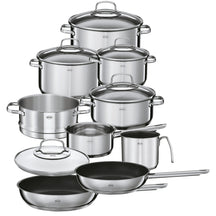 | Boîte de contenu | Sets de cuisson 10 pièces, 3 x Casserole + Couvercles, 2 x Poêle, Poêle wok, Cocotte, Casserole, Cruchon, Insert vapeur |