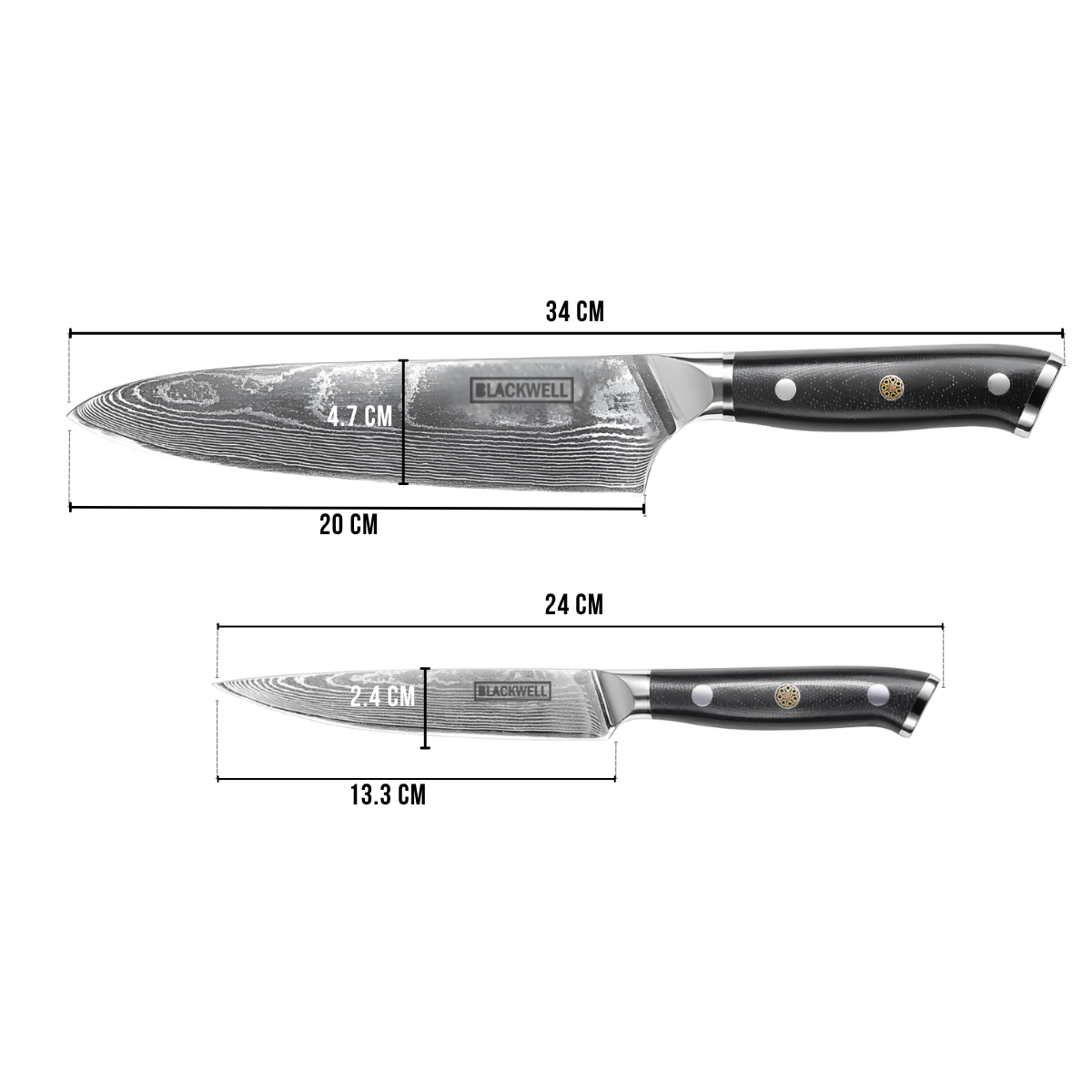 Description Set de couteaux Blackwell (Couteau de chef + Couteau de bureau) - Style japonais - Acier damassé 67 couches - VG10 - 2 pièces