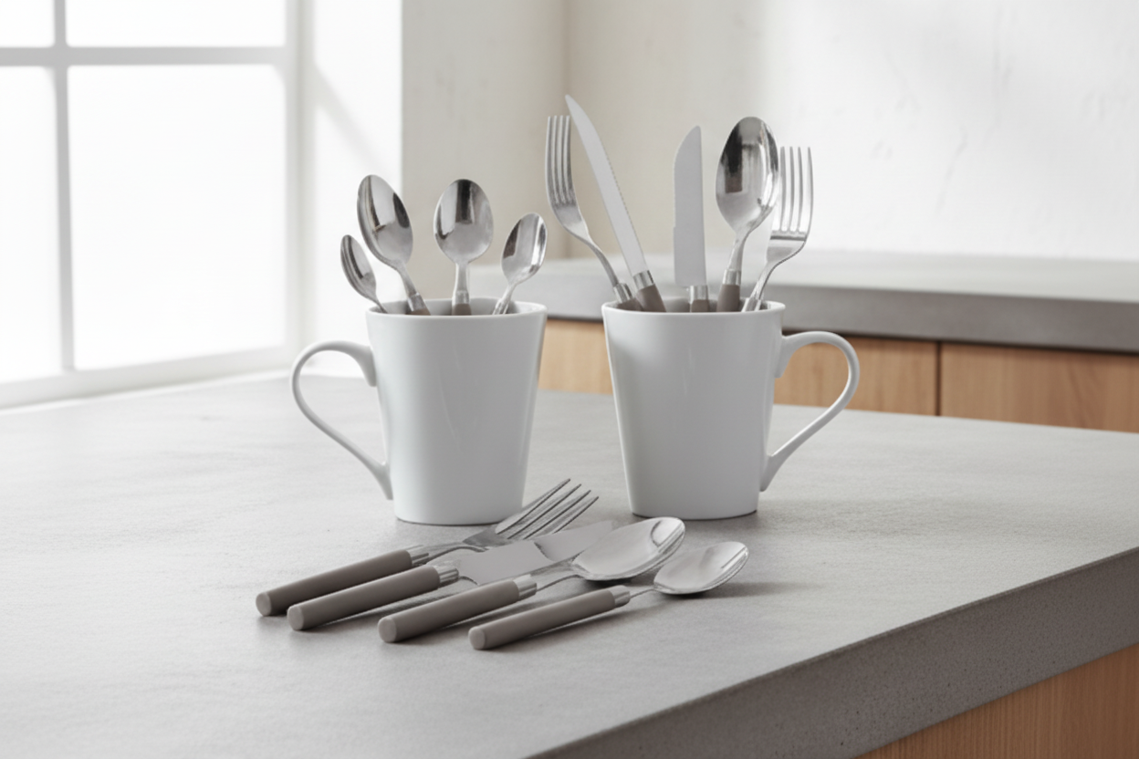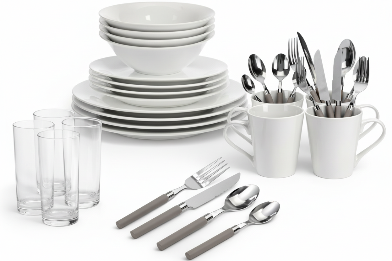 La porcelaine de ce service est robuste, avec une surface lisse qui ne retient pas les odeurs ni les taches. Les verres en verre, les couverts en acier inoxydable et les tasses aux anses solides completent l'ensemble avec coherence. Tout est con^u pour resister a un usage intensif - parce que la qualite, chez Cookinglife, c'est ce qui dure dans la vraie vie, pas seulement dans les magazines.