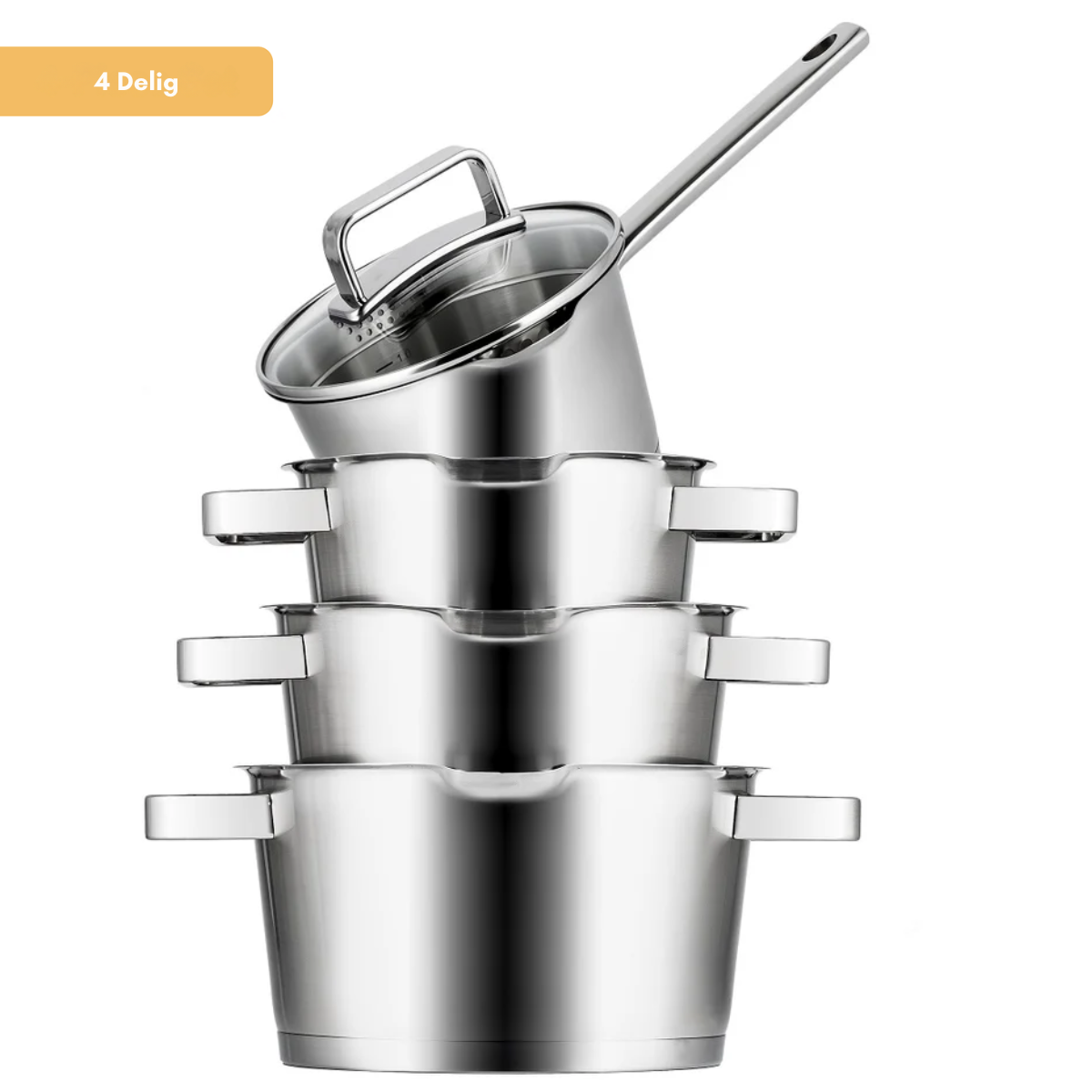 Cet ensemble de casseroles coniques se compose de quatre pièces en acier inoxydable 18/10 de haute qualité. Les poêles sont polies mates et équipées de poignées brillantes. Cet ensemble contient un faitout de 16 cm, un faitout de 18 cm, un faitout de 20 cm et une casserole de 16 cm - tous avec couvercles.