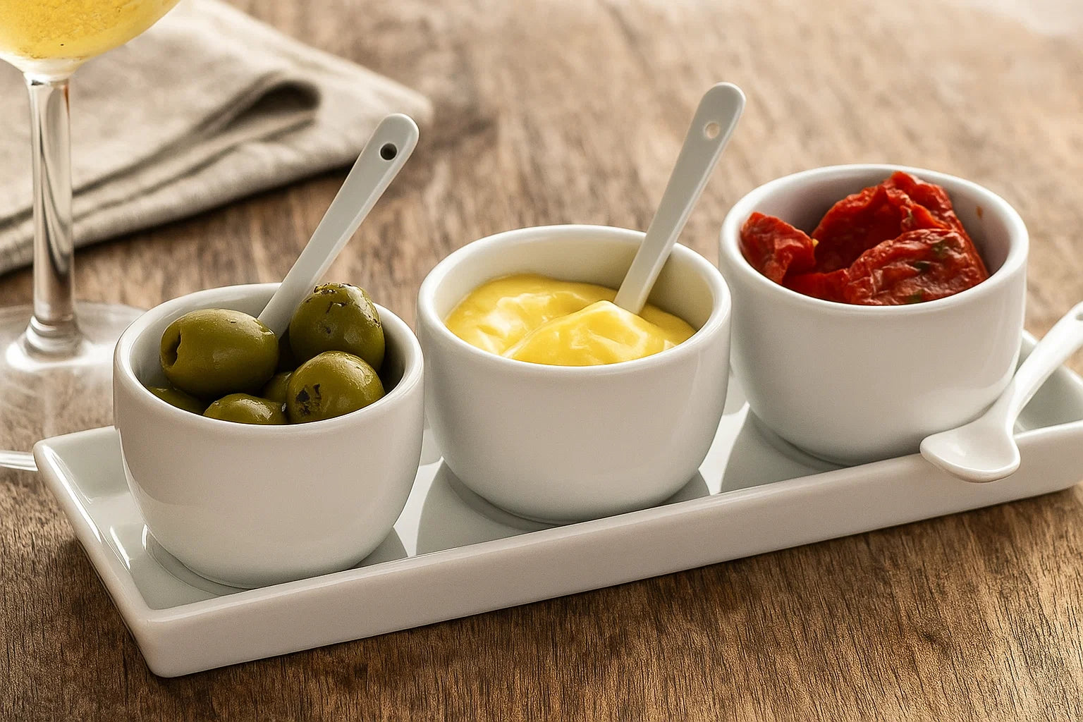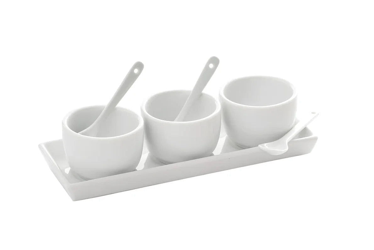 Profitez dès maintenant de ce service de coupelles à trempette. Dans ce service à sauces de 7 pièces, vous pouvez servir toutes sortes de sauces. Cet ensemble se compose d'une planche de service, de 3 coupelles à trempette et de trois cuillères à sauce. Les 3 coupelles à trempette ont une capacité de 100 ml et sont en porcelaine.